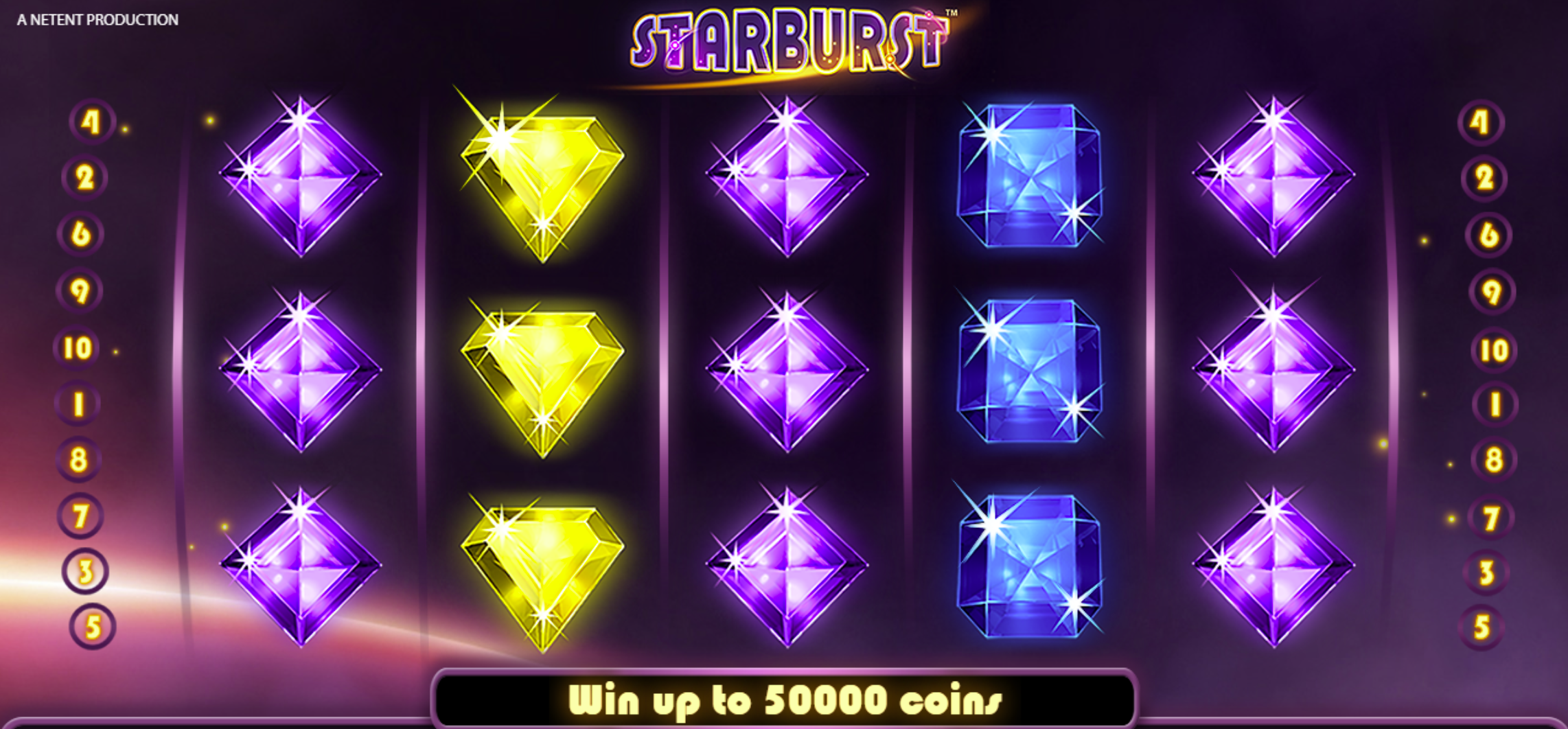 Starburst uses a simple 5-reel, 3-row layout with 10 fixed paylines. Wins are formed by landing matching symbols on adjacent reels from either left to right OR right to left (Both Ways), effectively doubling your chances on every spin. The gameplay is fast-paced, with wins triggering satisfying gem-crushing animations.